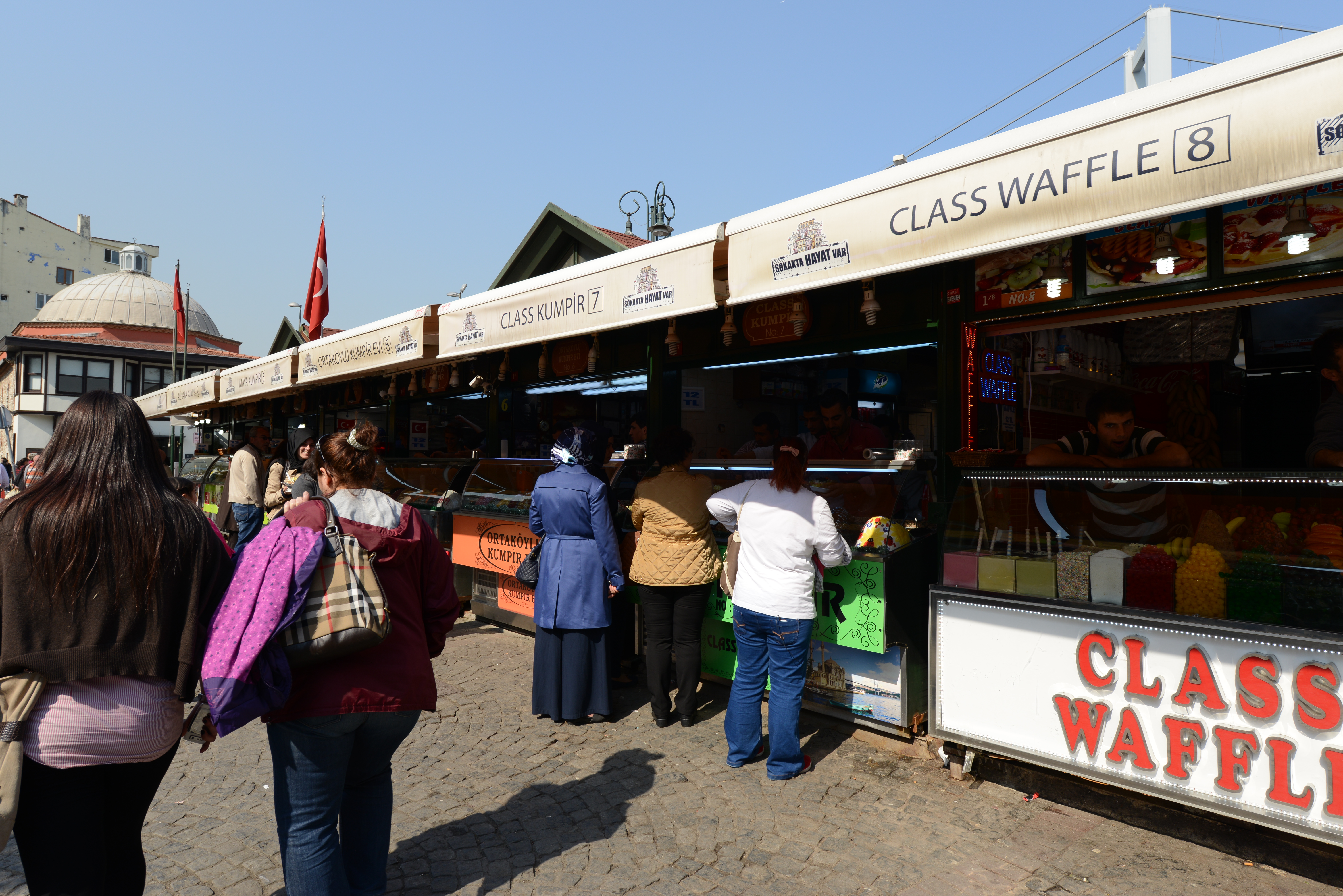 There are rows and rows of food stands here, most of which offer waffles or baked potatoes. Waffles in Europe are eaten as a dessert, and the stands make them fresh and offer several toppings. The most impressive customization comes from the potato stands, though, which have display cases full of different meat and vegetable options. Forget sour cream and bacon bits – these potatoes are a completely different level.